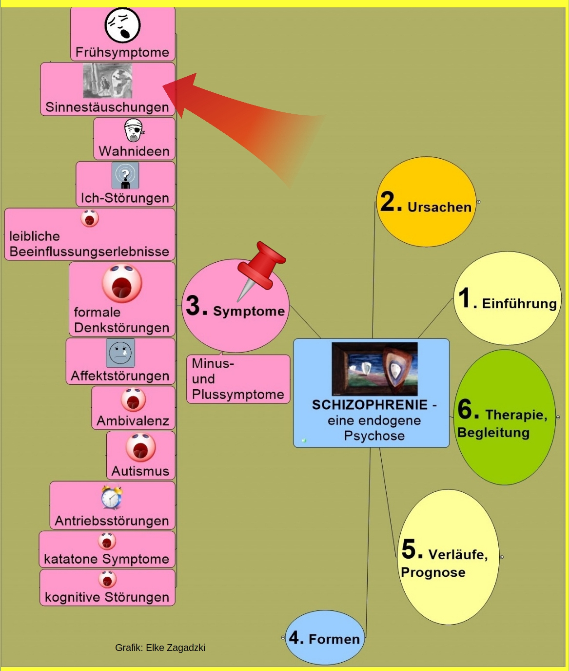 Ist – rein übersetzt – die Lehre von dem Leiden der Seele. Ihre Aufgaben sind das Erkennen, Beschreiben und Analysieren von seelischen Auffälligkeiten. Sie liefert das psychiatrische „Vokabular“ . Mit ihrer Hilfe entsteht ein psychischer Befund in der Psychiatrie. In meiner Grafik bedeutet dies, dass man die Schizophrenie nur durch das Beobachten, das Sammeln und Beschreiben aller typischen Symptome diagnostizieren kann. Es gibt nichts Anderes, keine Blutbefunde oder Gehirnveränderungen, die man in einer bildgebenden Untersuchung finden könnte.