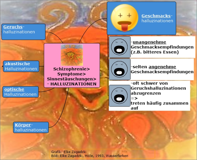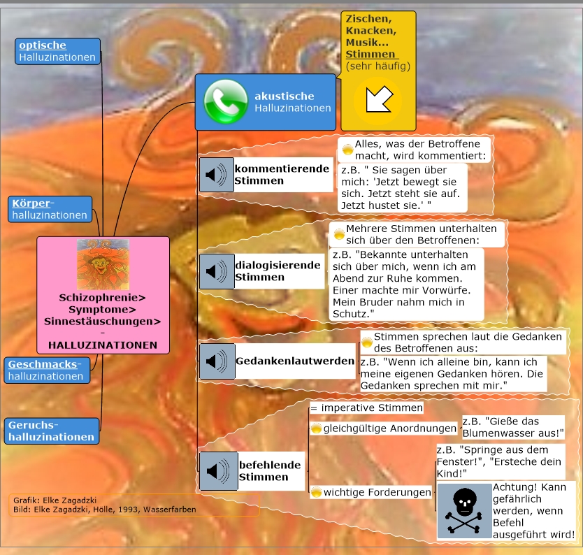 Das untere Bild – ich habe es ganz altmodisch als Folie auf einem Overhead benutzt – diente mir als Leitfaden für einführende Worte zum Thema Schizophrenie. Zuvor hatte ich – wie bei jedem neuen Thema – mit meinen Zuhörern ein Brainstorming darüber gemacht. Wir haben also alle spontanen Einfälle zu „Schizophrenie“ gesammelt und an die Tafel geschrieben. Ich fand es jedesmal total spannend, wie vielfältig, treffend und kreativ diese Einfälle waren. Auf jeden Fall kamen wir so ins Gespräch. Es war immer sehr lebhaft. Ich brauchte eigentlich nur noch alles gut zu sortieren und zu „verfachlichen“. Die Inhalte zum Thema gaben mir die Schüler selber.