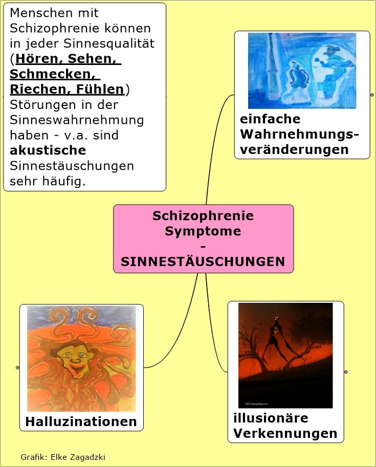Sinnestäuschungen sind sehr vielfältig. Sie können als einfache Wahrnehmungsveränderungen, illusionäre Verkennungen oder Halluzinationen in allen Sinnesbereichen auftreten.